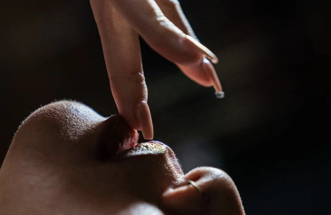 Close-up of a person's face with lips slightly parted and a finger approaching, with a dark background.